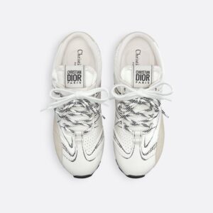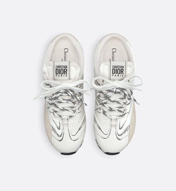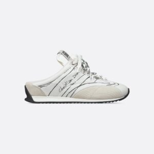 The D-Sketch sneaker offers a hallmark retro aesthetic in the form of a mule. Constructed in white nylon and calfskin, it stands out with printed markings inspired by the production stages of shoemaking, panels in beige suede calfskin and double lacing. The handwritten Christian Dior Paris signature appears on the sides, while a Christian Dior Paris tag adorns the tongue. Complete with a thin sole in two-tone rubber, the sneaker will lend a couture touch to any casual look.