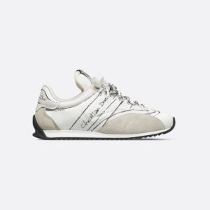 Debuting as part of the Spring-Summer 2025 Ready-to-Wear Fashion Show, the D-Sketch sneaker reflects a hallmark retro aesthetic. Crafted in white nylon and calfskin, it features printed markings inspired by the production stages of shoemaking, panels in beige suede calfskin and double lacing. The handwritten Christian Dior Paris signature appears on the sides, while a Christian Dior Paris panel and tag adorn the heel counter and tongue. Complete with a thin sole in two-tone rubber, the sneaker will lend a couture touch to any casual look.