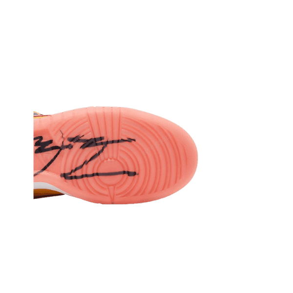 The Futura Laboratories x Nike Dunk Low SB ‘Sunblush’ Friends & Family showcases the legendary graffiti artist’s multicolor designs throughout the leather upper. A gradient yellow finish is applied to the quarter panel, offset by leather Swoosh in a soft coral hue. Atop the stuffed tongue, a woven tag displays dual Futura and Nike SB branding. The artist’s signature appears on the lateral heel, while the FL logo is stamped on the opposite side. The sneaker rests on a durable cupsole, featuring white sidewalls and a pink-tinged translucent rubber outsole.