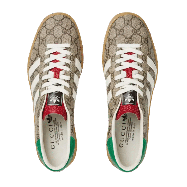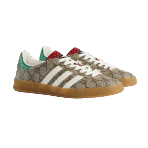 The Gucci x Adidas Gazelle Beige GG Monogram merges luxury and streetwear, featuring the classic Adidas Gazelle silhouette adorned with Gucci’s signature beige GG monogram. The sneaker combines soft suede, retro-inspired design elements, and distinctive branding from both fashion houses, making it a standout choice for sneaker enthusiasts seeking elegance with a sporty edge.