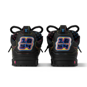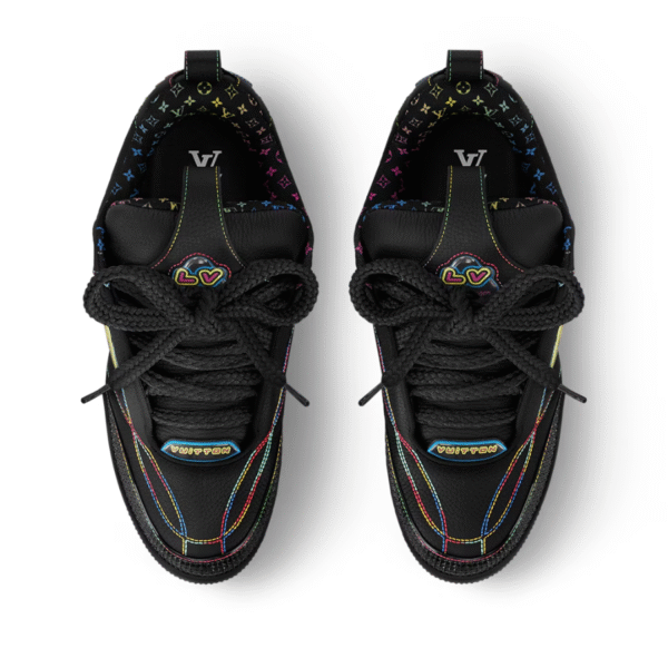 The LV Trainer sneaker is reimagined in a bold black palette with vibrant rainbow accents.