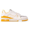 Crafted from supple white calf leather, this version of the LV Trainer sneaker is part of the season’s Rainbow ready-to-wear capsule collection. This cult model was designed by Louis Vuitton Artistic Director Virgil Abloh and inspired by vintage basketball sneakers. Its elaborately constructed upper, which features rubber LV and Vuitton signatures, takes seven hours to stitch.