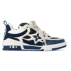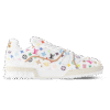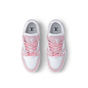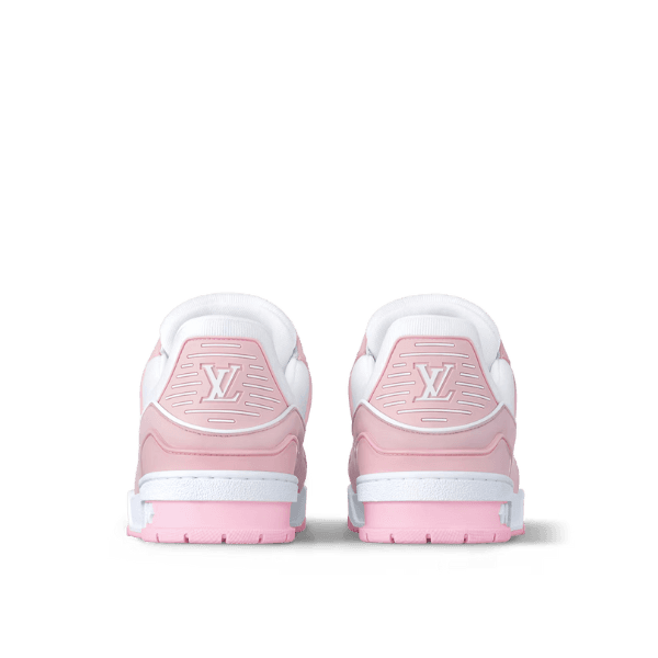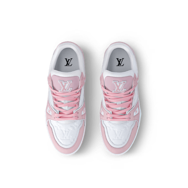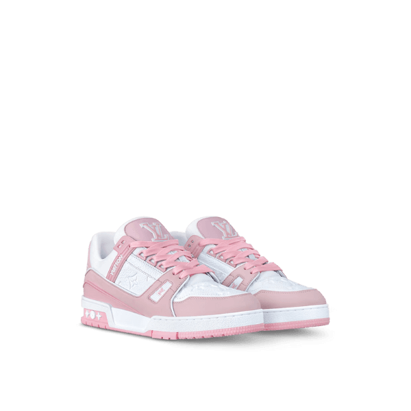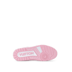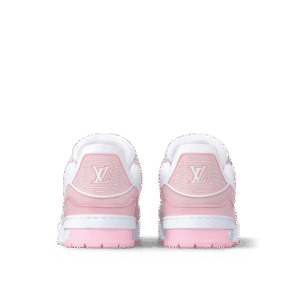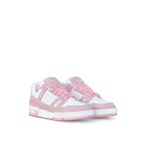 The iconic LV Trainer sneaker, originally designed for men by Virgil Abloh, is reinterpreted for women. This version comes in grained calf leather, which is partially debossed with the Monogram pattern, while its two-tone, pastel color scheme adds a feminine touch. This model is notable for its rubber signatures and technical outsole with Monogram Flowers.
