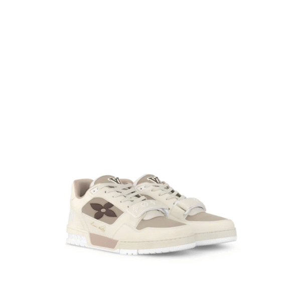 Crafted from supple white calf leather, this version of the LV Trainer sneaker is part of the season’s Rainbow ready-to-wear capsule collection. This cult model was designed by Louis Vuitton Artistic Director Virgil Abloh and inspired by vintage basketball sneakers. Its elaborately constructed upper, which features rubber LV and Vuitton signatures, takes seven hours to stitch.