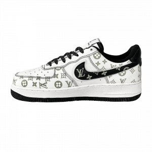 Dripping in designer appeal, this custom Louis Vuitton x Nike Air Force 1 is crafted for those who lead with edge. A crisp white leather base is layered with an all-over LV monogram in sage green, contrasted by deep black overlays, laces, and sole.