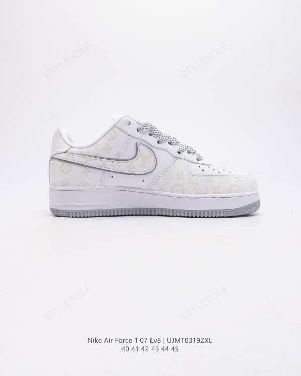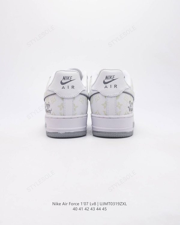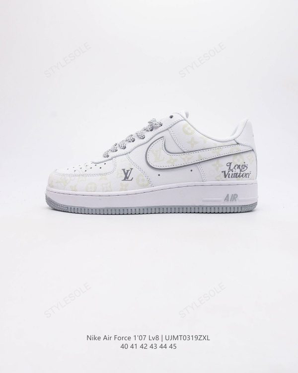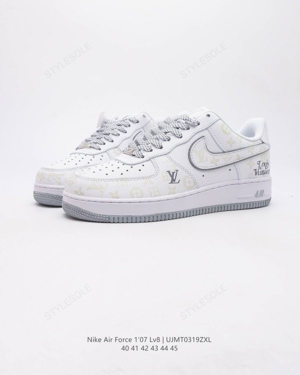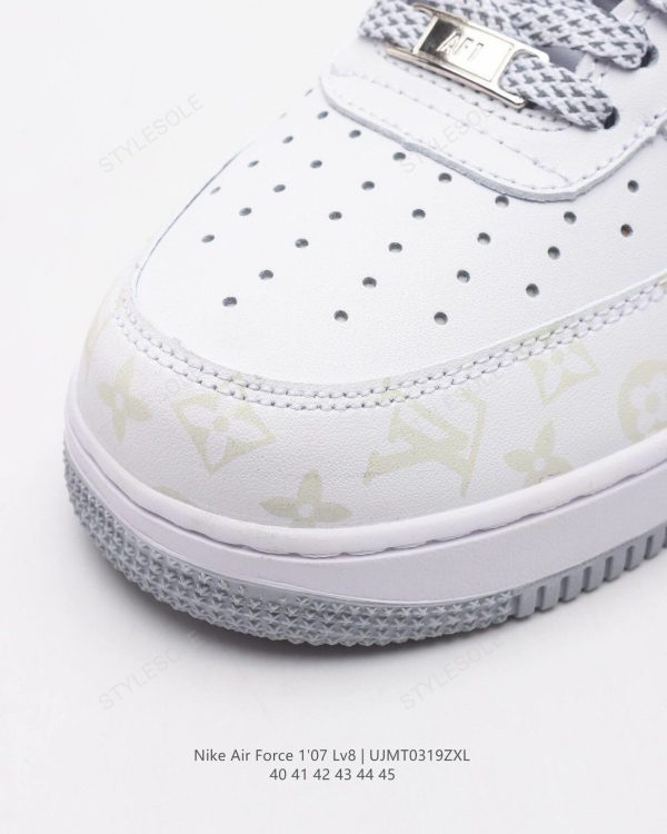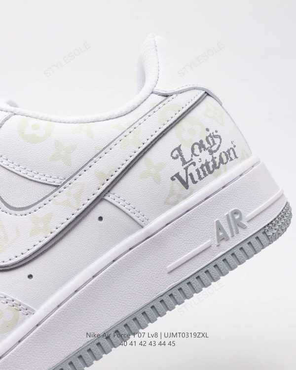 This custom Louis Vuitton x Nike Air Force 1 blends high fashion with cool street energy. A smooth all-white leather upper is wrapped in soft grey LV monogram patterns, delivering a tonal, understated look that whispers luxury.