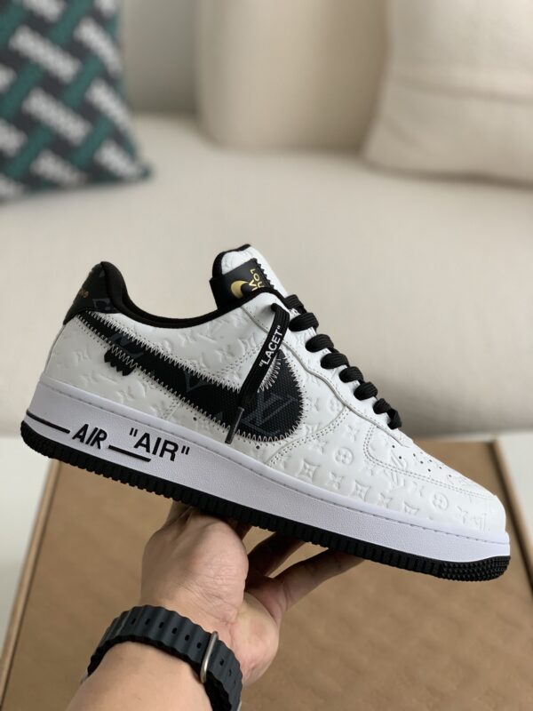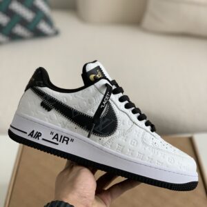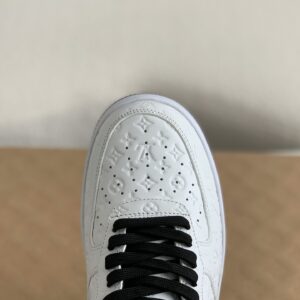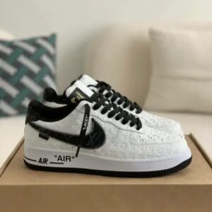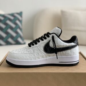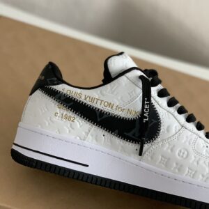 Imagine stepping out in these head-turning sneakers inspired by the legendary Louis Vuitton x Nike Air Force 1 Low collaboration. This striking white and black design seamlessly blends streetwear and high-fashion, featuring the signature Louis Vuitton monogram subtly embossed on the premium leather upper. Notice the meticulous craftsmanship in every detail, from the Off-White™️-inspired “LACET” tag and exposed stitching to the iconic “AIR” branding on the midsole. These sneakers offer a luxurious look and feel that will elevate your sneaker game to the next level.