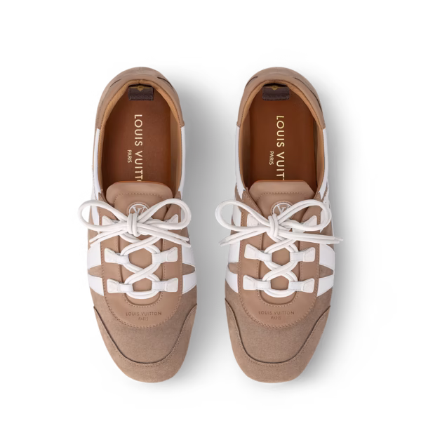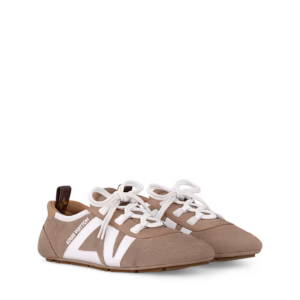 Velvety suede calf leather complements the sleek lines of the LV Sneakerina, an innovative design combining the lightness of a ballerina with the comfort of a sneaker. This stylish model features rich details, including an LV signature on the side and a back loop in Monogram canvas. Its sacchetto construction and TPU outsole provide lightness and flexibility.