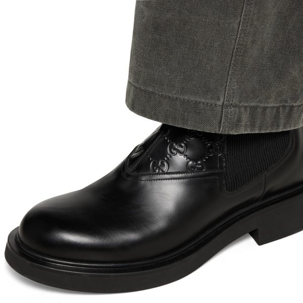 Rooted in the House’s heritage, this men’s ankle boot is crafted in smooth leather and enriched with an embossed GG leather detail—an emblematic nod to Gucci’s iconic monogram. A rubber sole featuring the GG motif enhances the design with a contemporary feel.