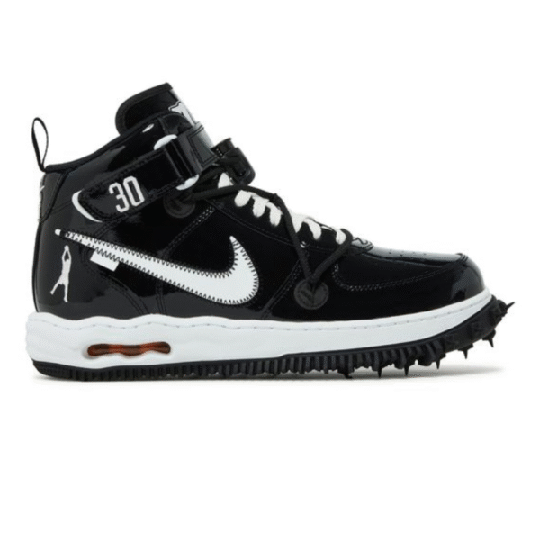 The Off-White x Nike Air Force 1 Mid SP Leather ‘Sheed’ takes inspiration from Rasheed Wallace’s AF1 High PE released in 2001 and features a glossy black patent leather upper complemented by a white Swoosh logo and an adjustable ankle strap. Elevating the mid-top silhouette is a distinctively contoured midsole with a scarlet-tinted Air-sole heel unit, which rides on a spiked rubber outsole. Rasheed’s logo is stitched on the lateral heel and Off-White touches including printed text on the medial side and a unique dual lacing system.