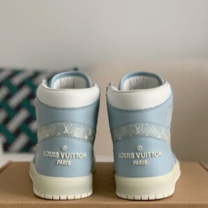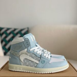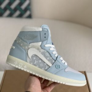 Elevate your sneaker game with the Air Jordan 1 x Louis Vuitton Monogram Sky Edition, a premium fusion of streetwear legacy and high fashion elegance. Featuring smooth sky blue leather overlays and iconic Louis Vuitton monogram canvas, this pair delivers both luxury and attitude. The reversed white Swoosh, soft off-white sole, and classic high-top build offer a refined yet edgy look. Designed for those who turn sidewalks into runways, this sneaker redefines contemporary style with a bold, couture-inspired twist