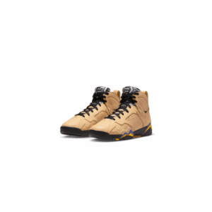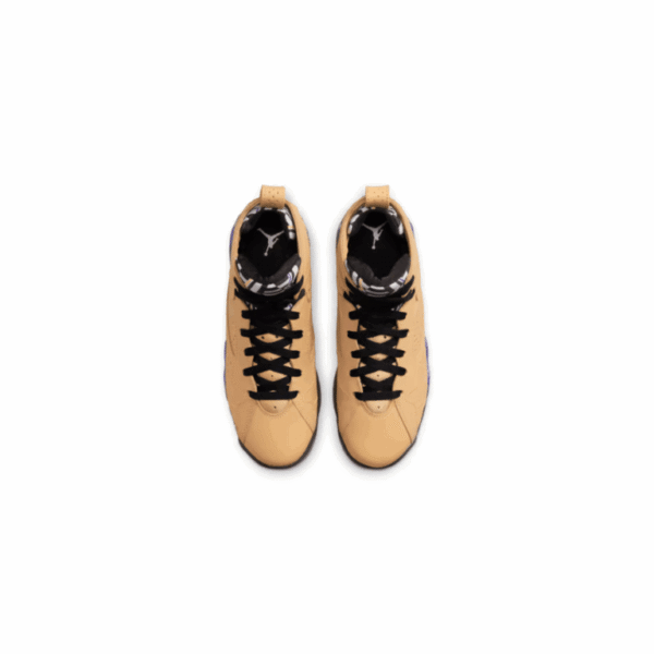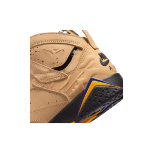 As a nod to Afrobeat’s combo of West African musical style and American jazz, soul and funk, the Air Jordan 7 Retro ‘Afrobeats’ reimagines a classic Jordan silhouette. The upper in Vachetta Tan leather delivers subtle embossing at the heel and on the forefoot. Standing out against this neutral base are the black laces and inner sleeve and tongue decorated with geometric imagery in black and white and the purple-and-gold ‘Air Jordan.’ The heel is adorned with the signature Nike Air logo. The all-black outsole is highlighted by the Air-assisted PU midsole, which echoes the colorful tongue with jagged purple and gold patterning.