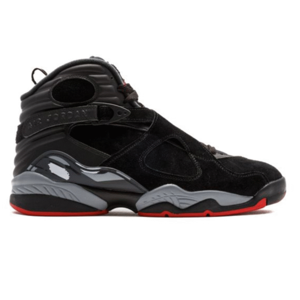 The Bred ‘ Air Jordan 8 Retro features a black leather and a Wolf Grey midsole nubuck upper. The ‘Bred’ released in September 2017 and also features Gym Red accents on the tongue, insole, and outsole.
