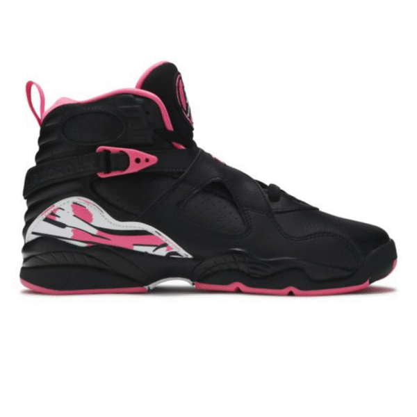 The Air Jordan 8 Retro GS ‘Pinksicle’ features vibrant accents on its grade-school construction. The shoe’s upper is built with black leather, supported by a cross-strap design secured by Pinksicle buckles. More Pinksicle marks the inner lining, branding, signature heel overlay and heel pull-loop, which provides easy on and off. Underfoot, a black Air midsole gives way to a final hit of Pinksicle on the rubber outsole.